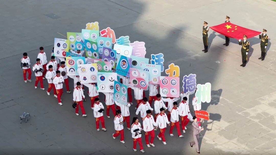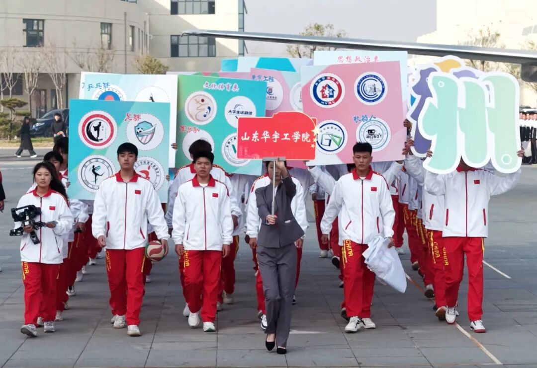 开幕式现场,各高校代表队依次整齐入场,尽展昂扬青春风貌。山东华宇工学院代表队以青春昂扬之姿阔步走来,48名青年学子手持118个社团社徽,每一步都彰显校园文化的蓬勃生机与活力。8台科技作品璀璨亮相,巧妙融合科技底蕴与体育精神,尽显创新风采;中间9组文化体育类社团阵列整齐,以矫健姿态诠释“青春悦动”的蓬勃朝气,成为全场视觉焦点。“青春悦动 活力德州”主题耀眼夺目,两侧“建百年华宇 创特色名校”的条幅迎风展扬,既传递出活动的核心理念,更彰显着山东华宇工学院的宏伟发展愿景。