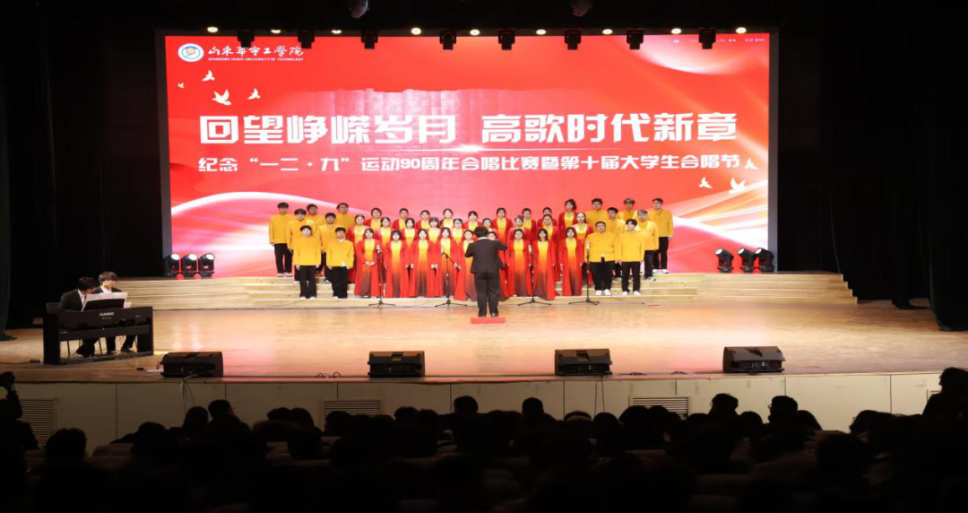 12月8日晚,学校纪念“一二·九”运动90周年合唱比赛暨第十届大学生合唱节在国际文化中心圆满举行。比赛以“回望峥嵘岁月 高歌时代新章”为主题,全校六支参赛队精神饱满,用歌声歌颂党和国家成就,抒发爱国之情,传递青年坚定信念。比赛中,《唱支山歌给党听》《黄河大合唱》等经典红色歌曲轮番上演,熟悉旋律唤起师生记忆,激昂歌声感染观众,现场掌声不断。大学生艺术团的大型群舞《保卫黄河》将气氛推向高潮。最后,大学生合唱团合唱《天耀中华》《早安阳光》,歌声悠扬、催人奋进,为比赛画上圆满句号。