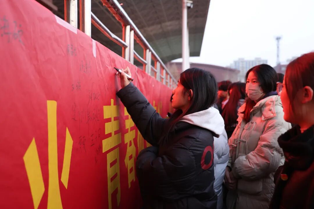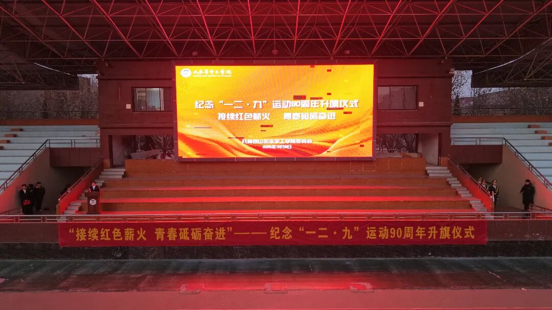 12月9日7时,纪念“一二·九”运动90周年升旗仪式在学校体育场举行,学校团委负责同志、各二级学院团总支书记、学生干部及团员代表600余人参加了仪式。国旗护卫队队员迈着铿锵步伐,护卫五星红旗走向升旗台。《义勇军进行曲》奏响,国旗升起,全体师生肃立注目。学生代表孔雨涵发表国旗下演讲,结合“一二·九”运动历史意义与青年使命担当,号召同学们以实际行动践行青春誓言。随后,在尚一鸣带领下,全体团员重温入团誓词。接着,师生欣赏朗诵《百年沧桑》,回顾峥嵘岁月。仪式最后,师生在主题横幅上签名,定格爱国初心。大家表示将以此次仪式为契机,把爱国热忱转化为动力,让“一二·九”精神绽放光芒。