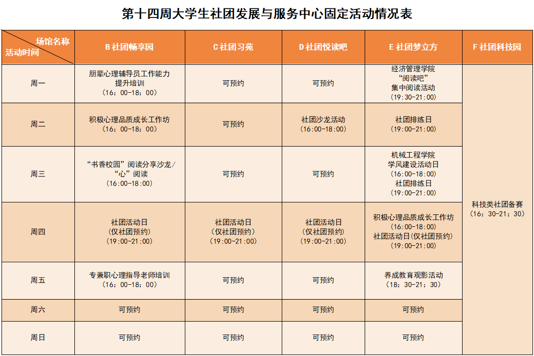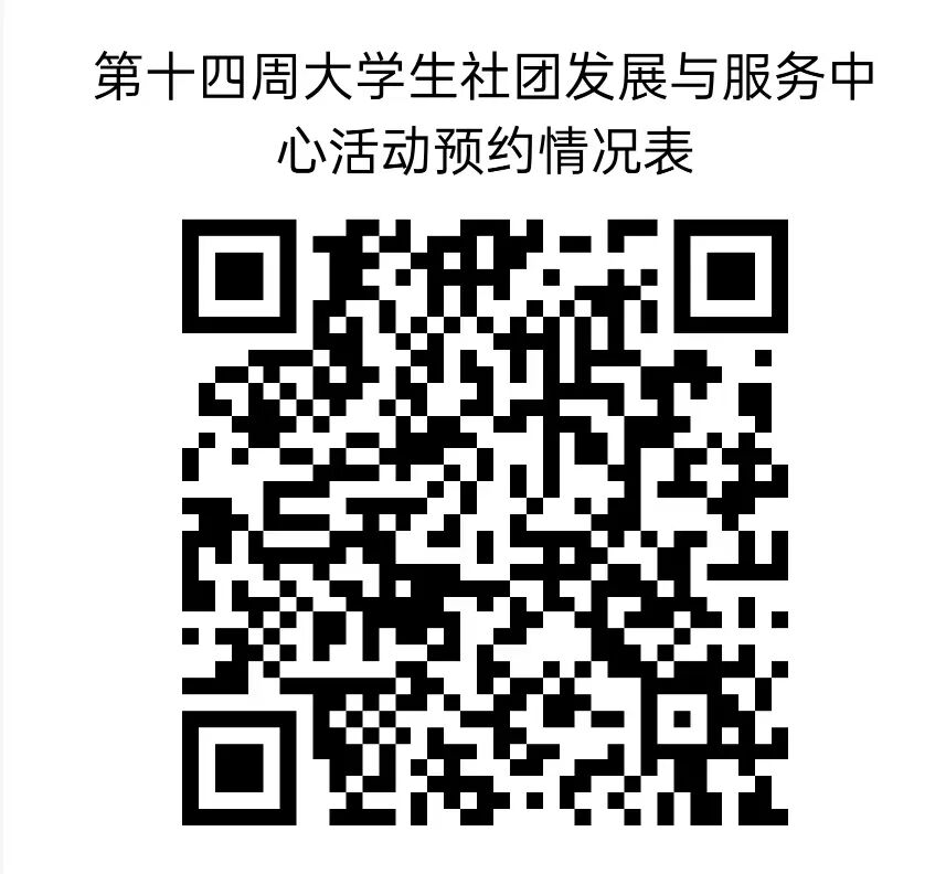 预约场馆可扫描下方二维码填写“第十四周大学生社团发展与服务中心活动预约表”进行线上预约,可提前电话联系场馆负责人员确认场地是否空余。
