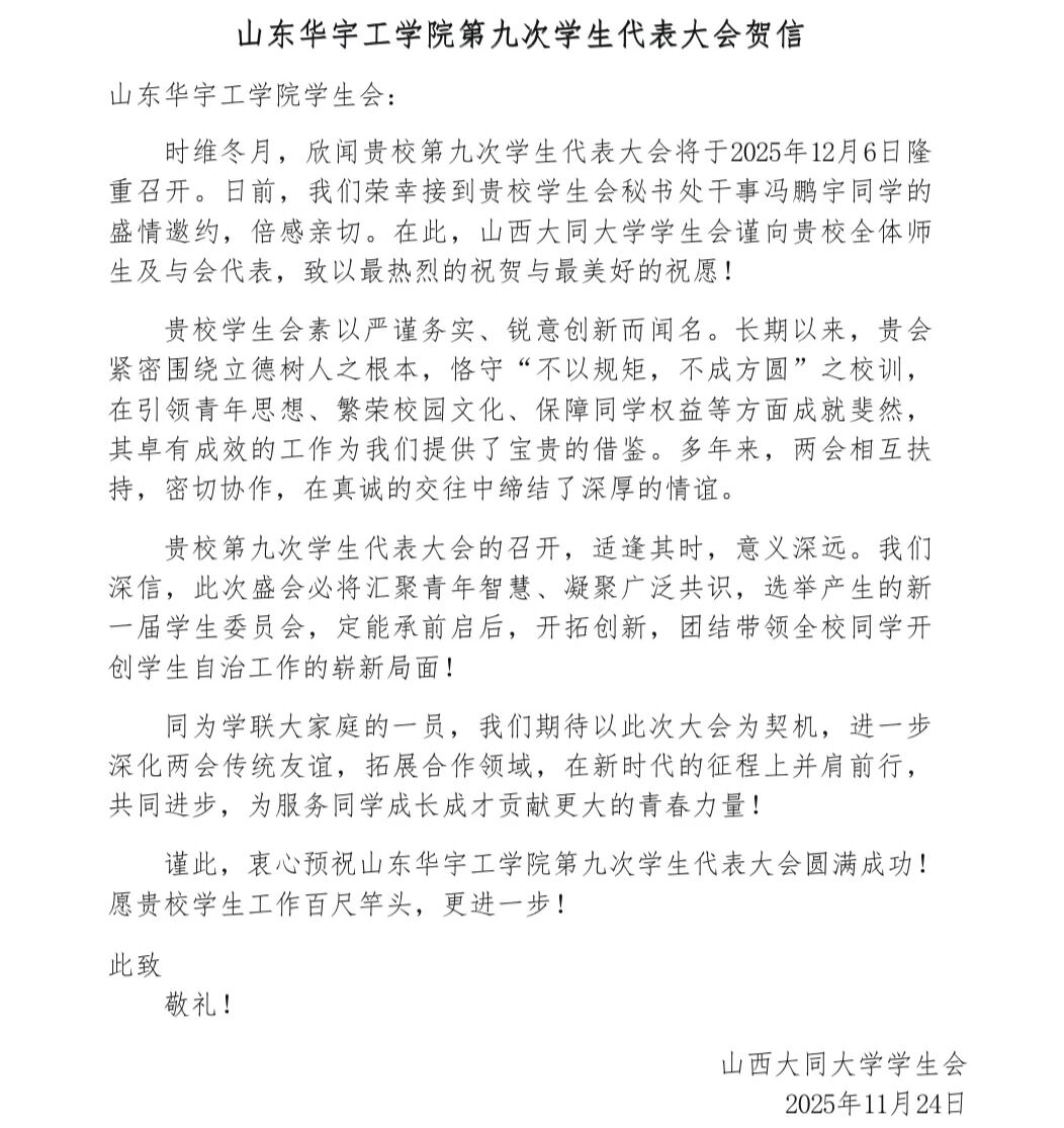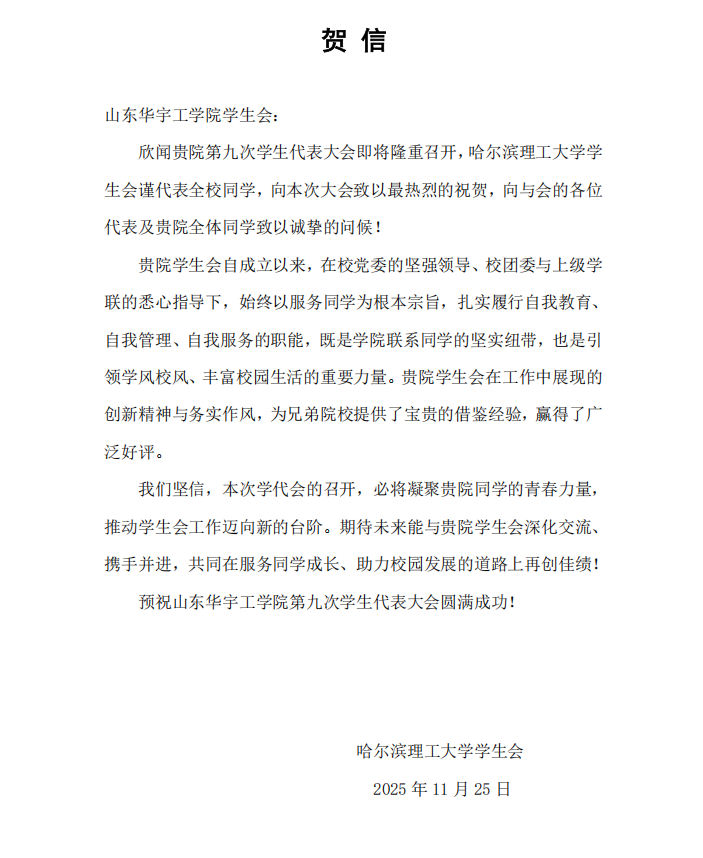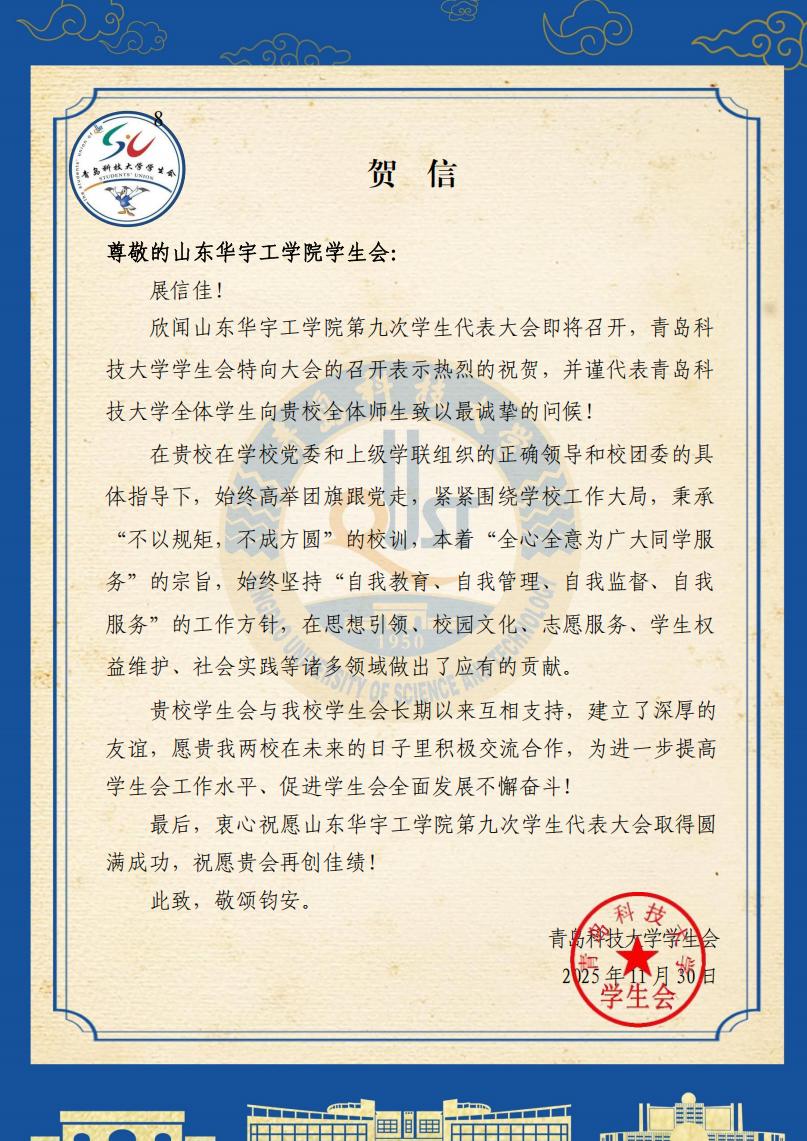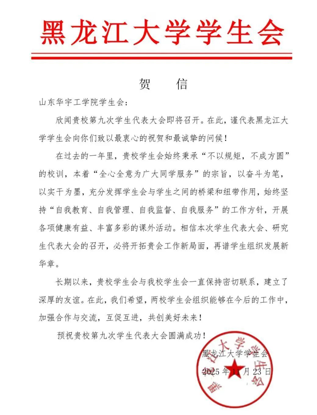 一纸贺信,承载校际同心的暖意;一声祝福,点燃青春逐梦的豪情。在此,向所有致贺的兄弟高校致以最衷心的感谢!你们的鼓励,是盛会启幕前最动人的序章;你们的支持,是华宇学子奋进路上最坚实的力量。