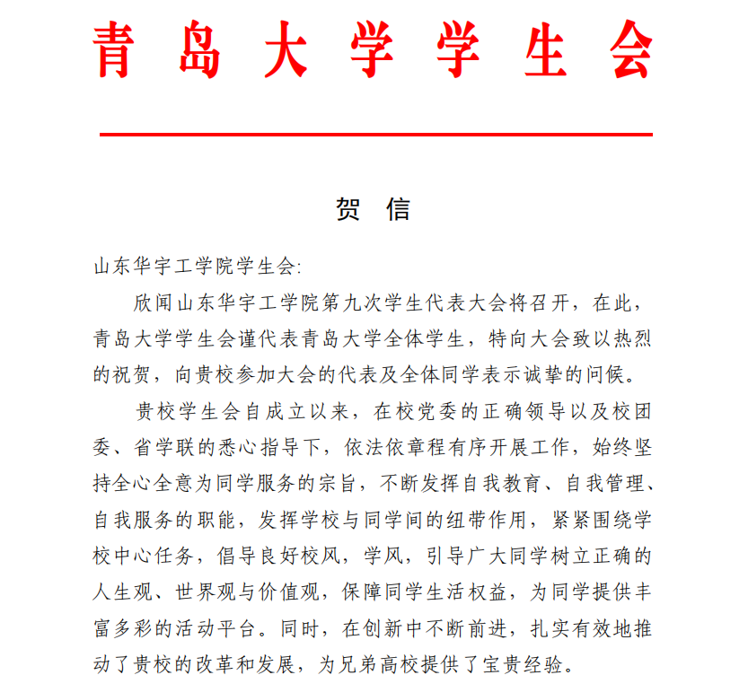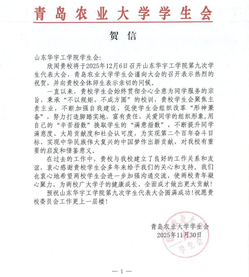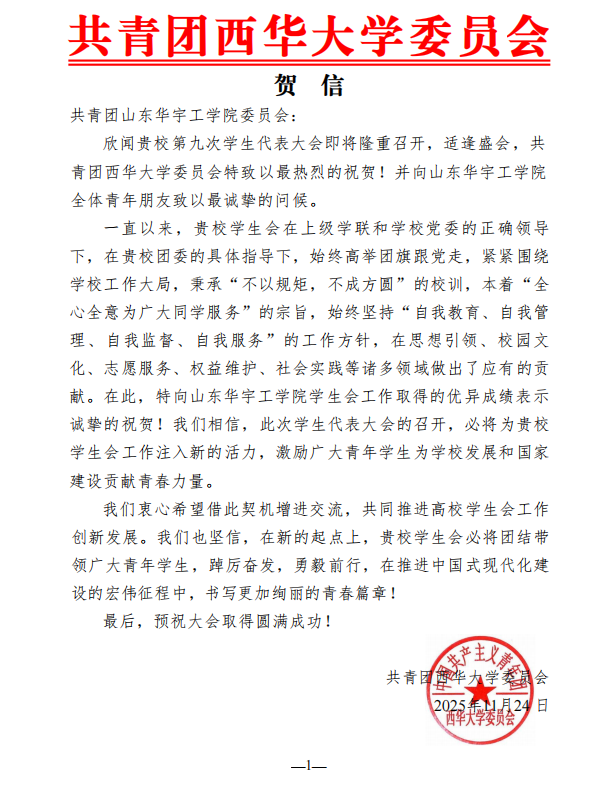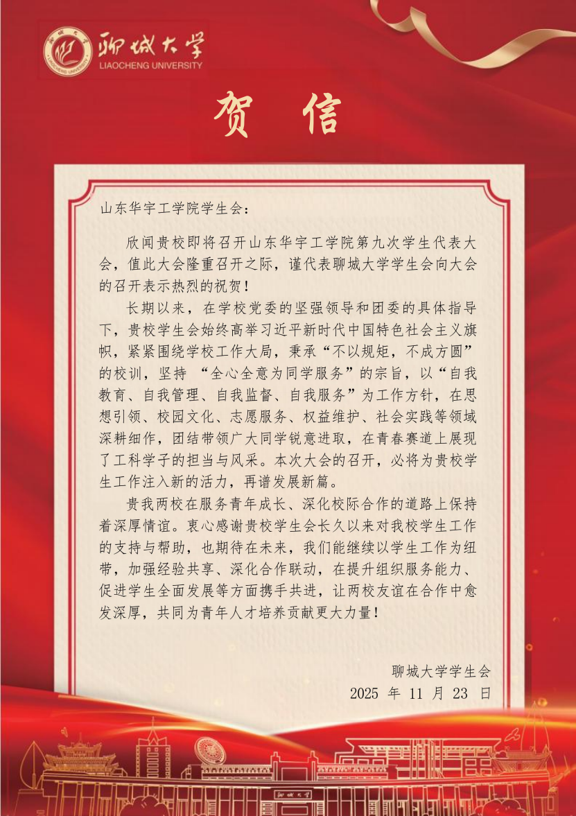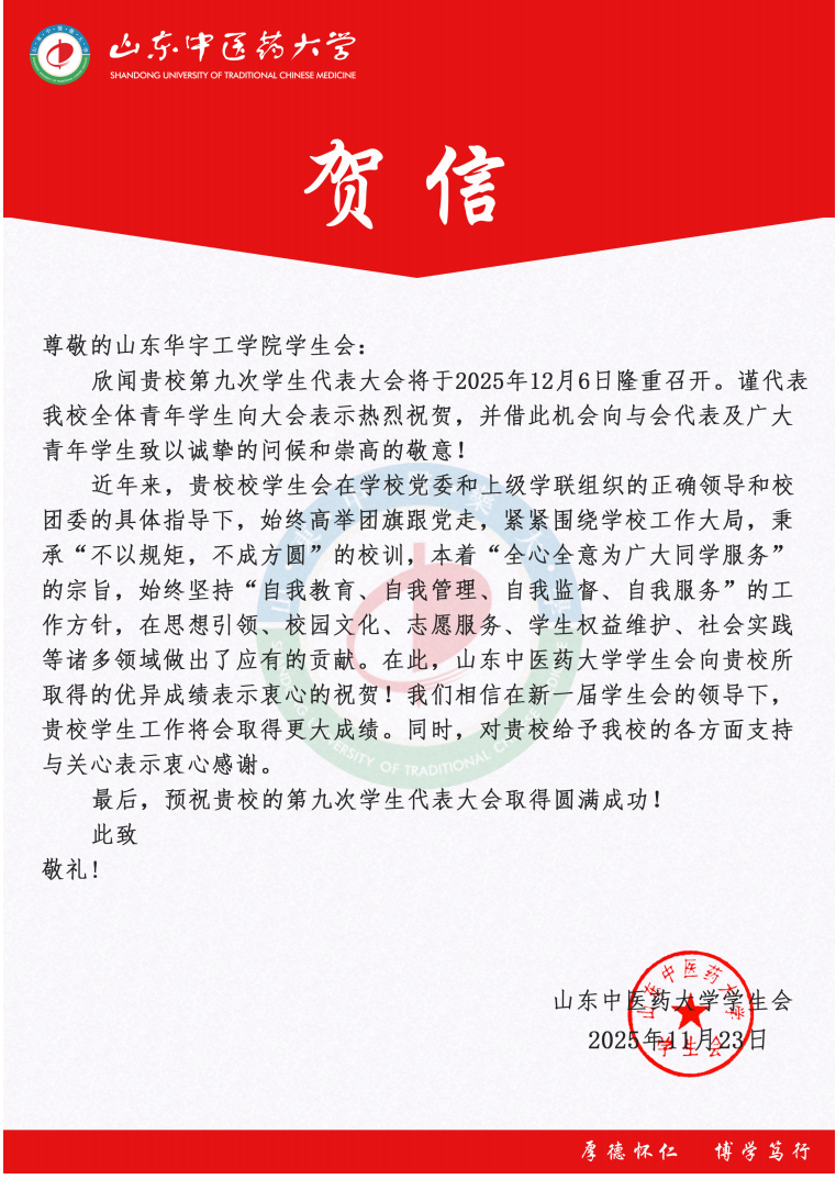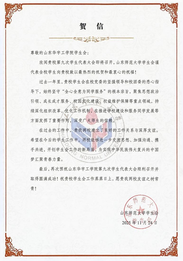 一纸贺信,承载校际同心的暖意;一声祝福,点燃青春逐梦的豪情。在此,向所有致贺的兄弟高校致以最衷心的感谢!你们的鼓励,是盛会启幕前最动人的序章;你们的支持,是华宇学子奋进路上最坚实的力量。