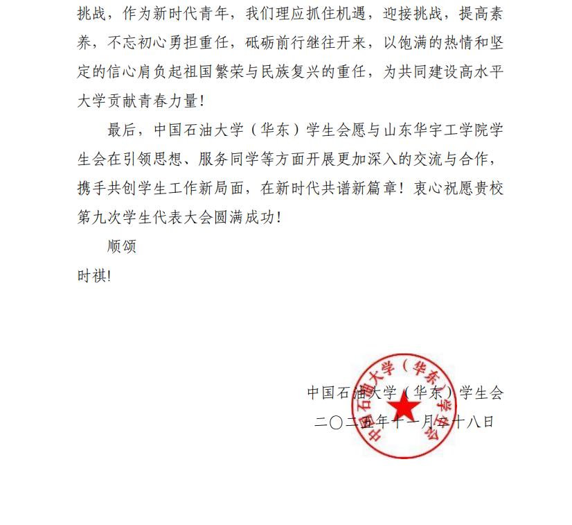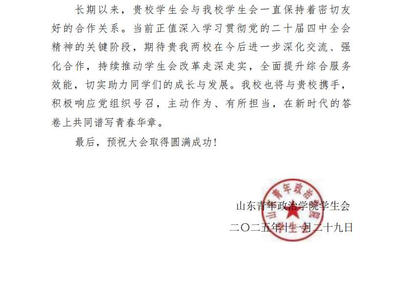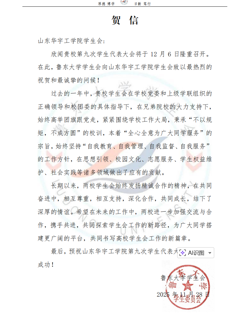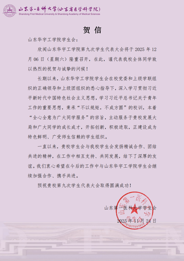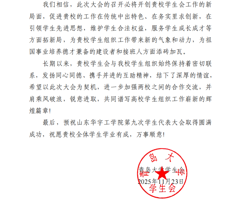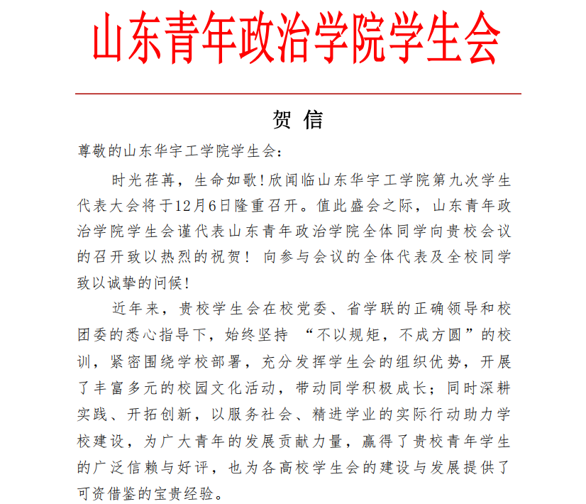 一纸贺信,承载校际同心的暖意;一声祝福,点燃青春逐梦的豪情。在此,向所有致贺的兄弟高校致以最衷心的感谢!你们的鼓励,是盛会启幕前最动人的序章;你们的支持,是华宇学子奋进路上最坚实的力量。